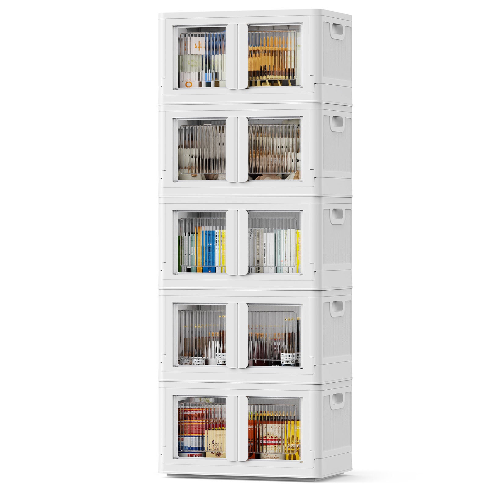 [High-Quality Material with Large Capacity] Each package of products contains 5-tier storage bins in black or white color. Each tier of storage bin can contain 19Gal of contents. The folded height of a single tier is only 3.9 inches. The plastic storage box is made of high-quality materials so that it can hold up to 110 lbs (50kg). The panel has been thickened, so the bins with doors are strong load-bearing. This is a must-have organizer for a tidy room.