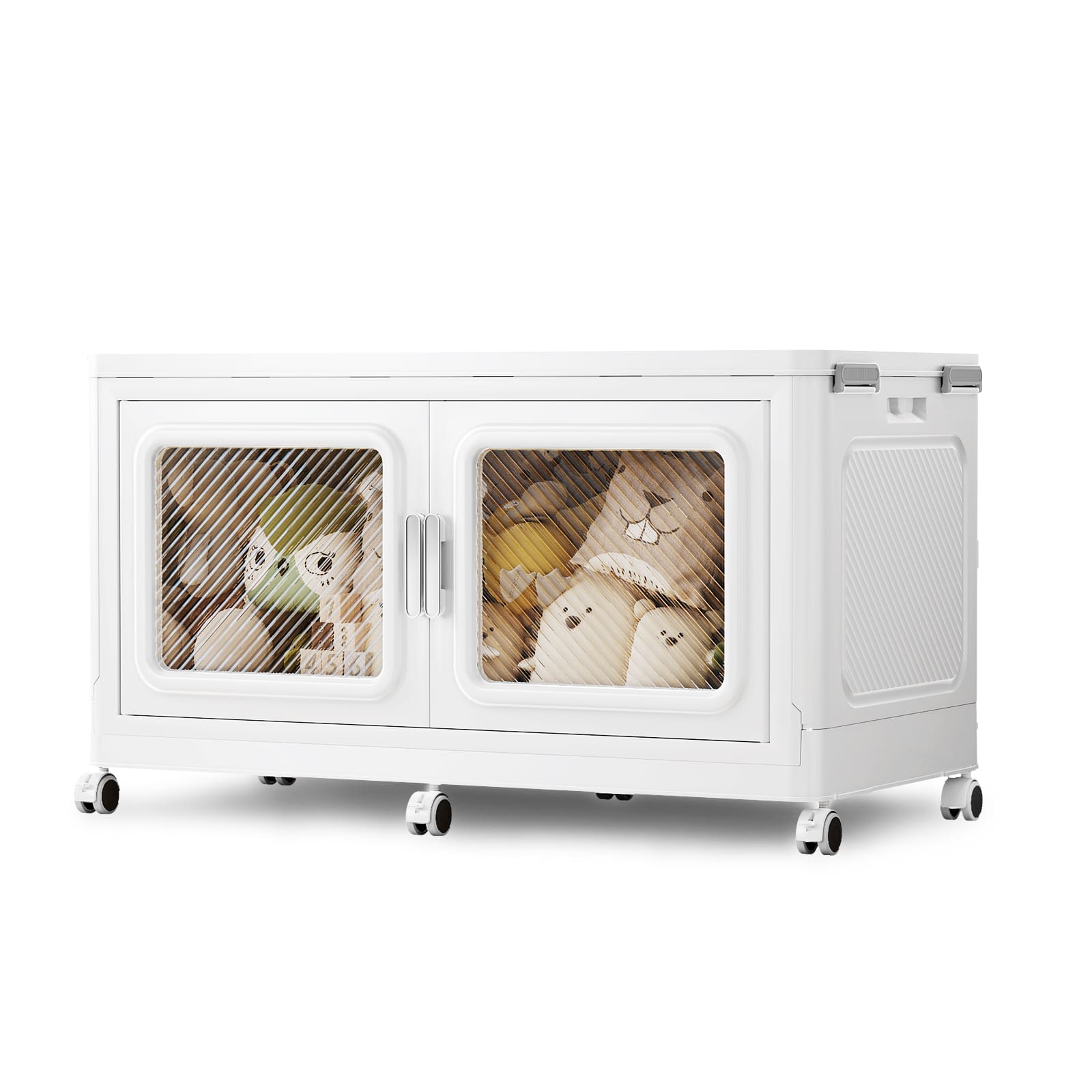 【Dual Opening Design】The BROVIEW V80 Plastic Storage Bins with Lid is features two opening methods - front double doors or top lid opening. The front door handle is designed with a magnetic lock, simply pull the handle to lock or unlock the storage cabinet. The front door opening is convenient for daily access, while the top opening is convenient for quick access to larger items such as clothes and blankets (One Lid, One Set)